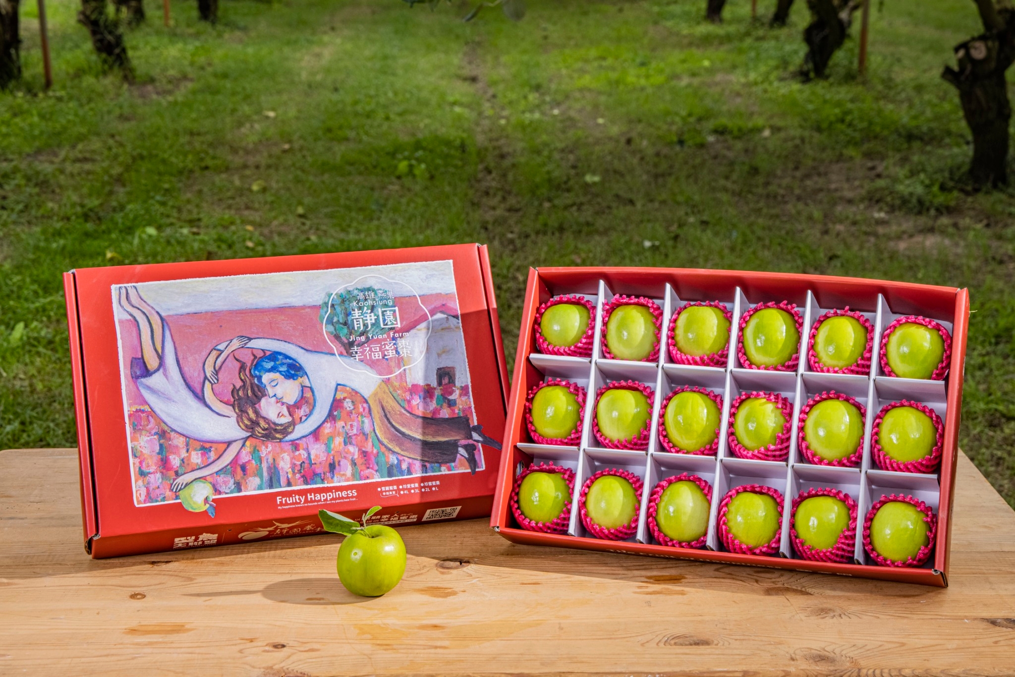 特別挑選有蜜棗界白雪公主稱號,風味有別於一般牛奶蜜棗的雪麗蜜棗,皮薄、多汁、清脆、甜蜜的口感,讓吃過的人,都期待每年產期的到來,能夠再次品嚐。禮盒的設計,內裝以九宮格模式的隔板,再加上蔬果套,逐顆包裝保護,雖然費工,但我們希望在送禮或宅配的過程,可以完整的送達;外觀則以傳統上充滿喜氣代表幸福的紅色為底色,搭配手繪印刷的圖面,呈現不同的質感,讓收到伴手禮的人,也能感受到送禮者的用心。